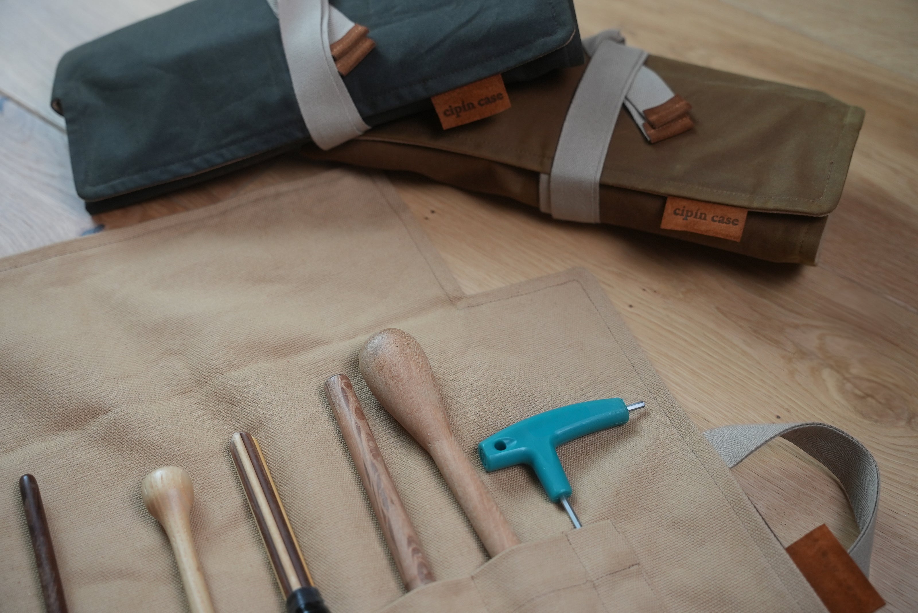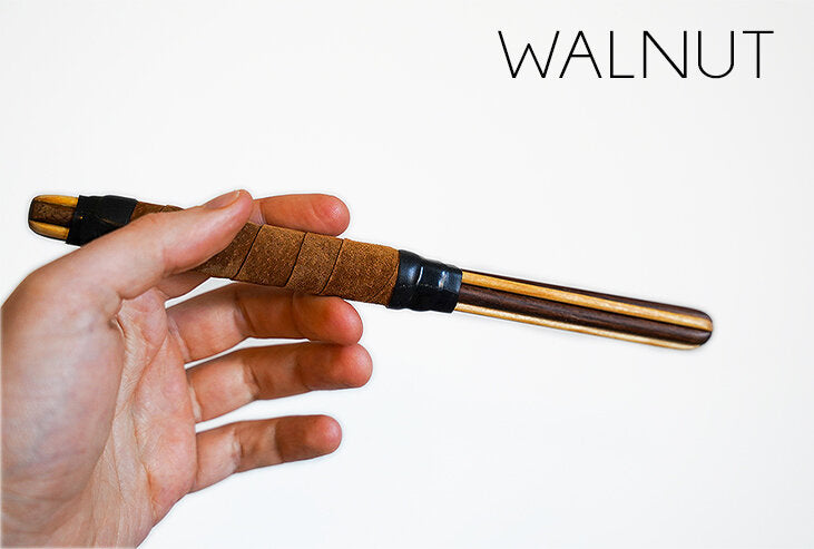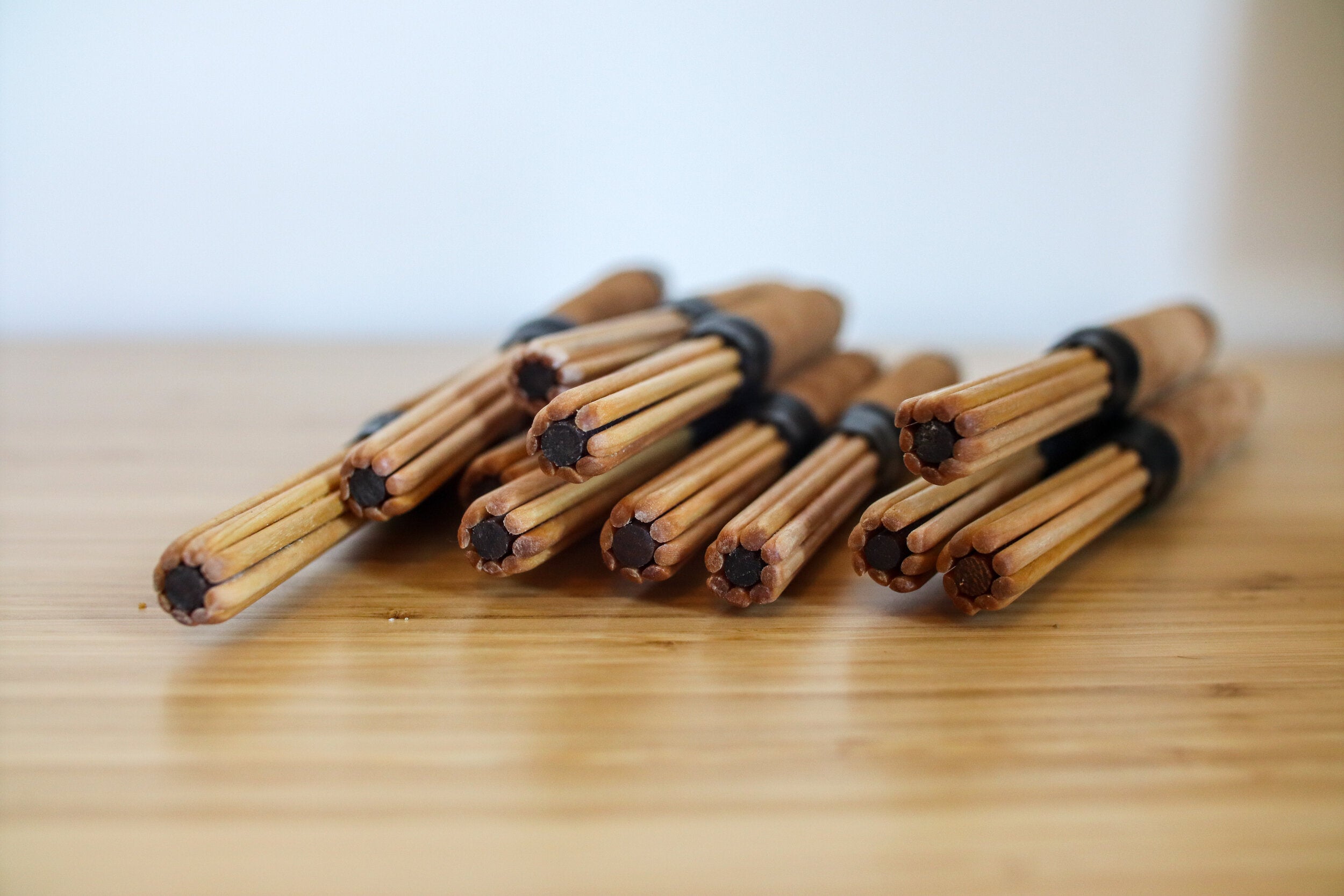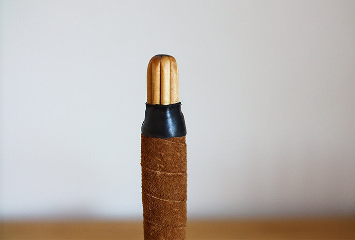 Each tipper is made with my own hands using carefully sourced and high-quality materials. Solid wood dowels which have been thrice treated to improve their strength and durability, and fine Italian suede which is a soft but strong natural grip.